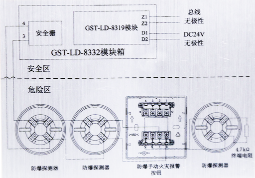GST-LD-8332編址接口模塊(以下簡稱編址接口模塊)可與防爆設備(防爆感溫、感煙、煙溫復合探測器、防爆手動報警按鈕等)配接,組成本安型防爆系統。一旦發生火災,編址接口模塊將報警信號通過總線傳入火災報警控制器(以下簡稱控制器),控制器產生報警信號并顯示出編址接口模塊的報警地址信息。當編址接口模塊本身出現故障時,控制器將產生故障信號并顯示編址接口模塊故障地址信息。