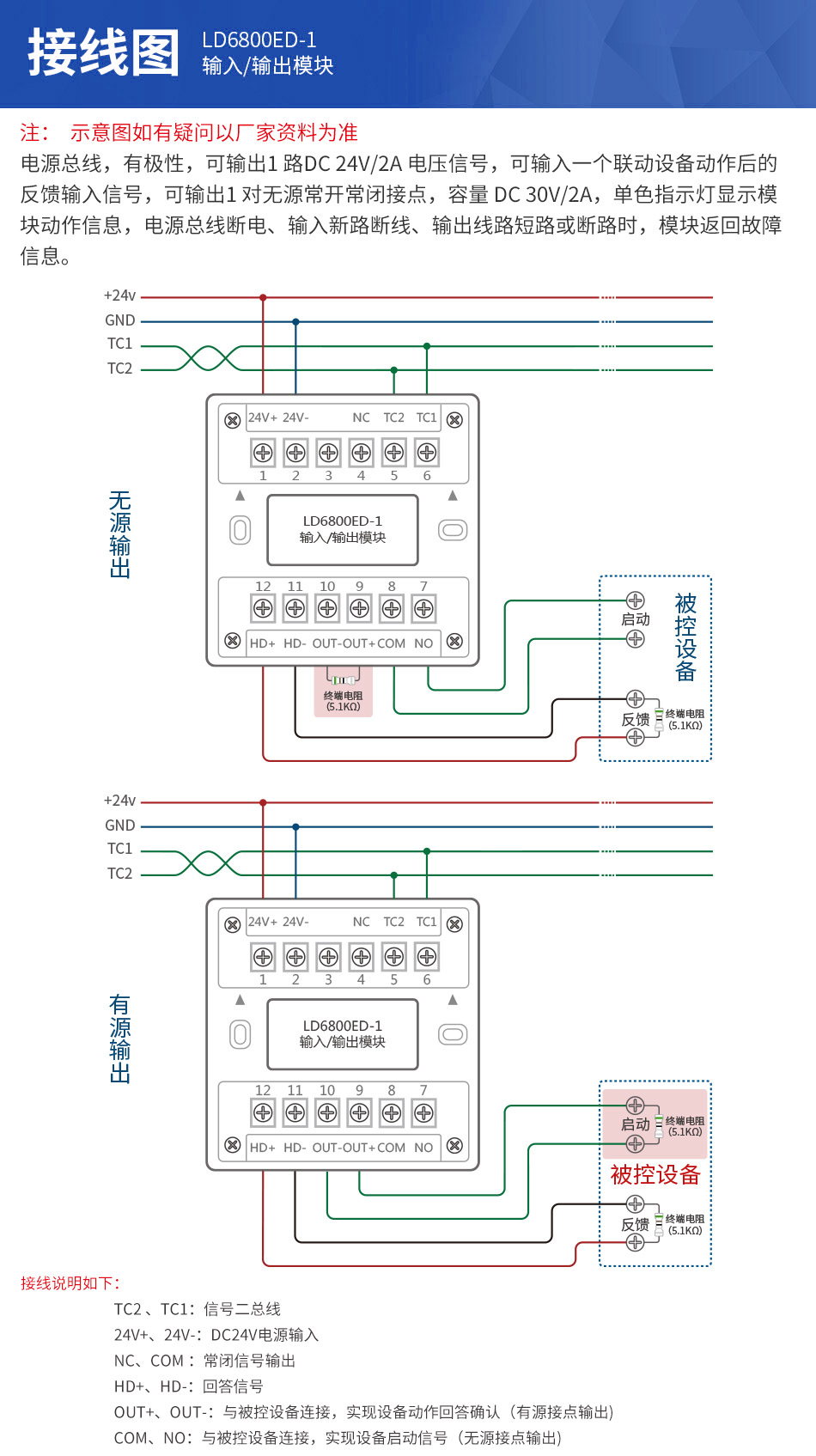 LD6800ED-1輸入/輸出模塊與E/EN/EL系列火災(zāi)報(bào)警控制器配合使用。LD6800ED-1輸入/輸出模塊通過二總線與E/EN/EL系列控制器連接,控制器通過二總線查詢模塊節(jié)點(diǎn)狀態(tài)、設(shè)置模塊節(jié)點(diǎn)參數(shù)、控制模塊啟動(dòng)輸出;模塊實(shí)時(shí)檢測輸入信號(hào)、輸入/輸出線路狀態(tài),當(dāng)出現(xiàn)反饋輸入或者輸入/輸出線路故障時(shí),模塊通過二總線上傳反饋或者故障信號(hào)。
