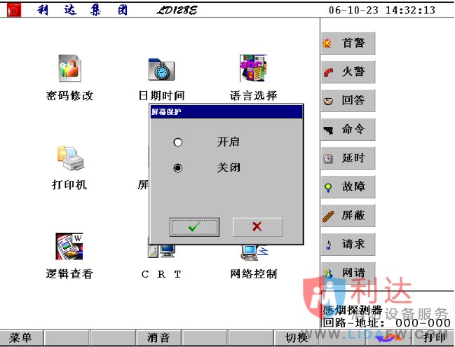 控制器可設置屏幕保護功能。設置后,在正常情況下,顯示屏熄滅。如發生火警、故障等任何事件或按動按鍵,顯示屏自動亮;如有報警,則顯示屏長亮。  畫面下方顯示當前設置狀態。  點擊開啟或關閉并確認可控制液晶保護功能。
