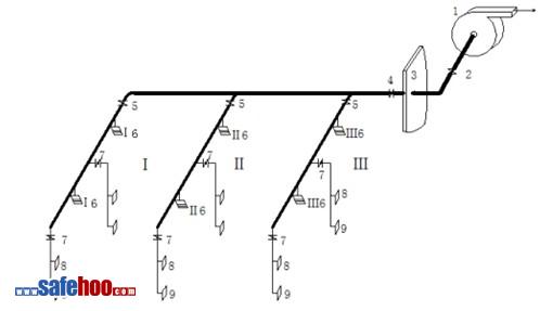 某商業建筑,建筑總高度26m,總建筑面職137519㎡。其地下一層為地下汽車庫、人防、設備用房和建筑面積為10000㎡的地下商業。地下汽車庫停車數499輛,建筑層高3.70m,凈高2.30m,主梁高0.90m, 車庫防火分區面積均小于4000㎡,防煙分區面積不大于2000㎡,機械排煙系統按防火分區設置,并按排風與排煙兼容的模式工作,且排風口與排煙口分開設置,系統排煙量按6次/h換氣次數計算,其中-大的一個機械排煙系統為PY(F)-B1-3系統,為防煙分區Ⅰ (面積1426㎡),防煙分區Ⅱ (面積1726㎡) 和防煙分區 Ⅲ(面積2000㎡) 服務,其排煙風機的排煙量為53280m3/h,系統構成見圖2-31-1。